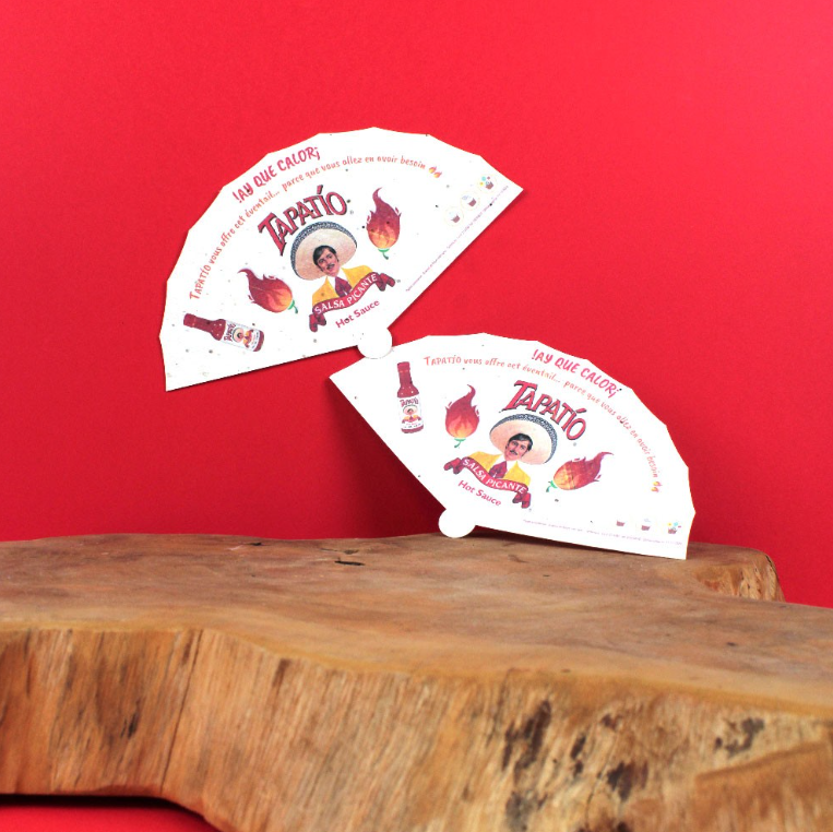 Le concept : Vos clients l’utilisent pour se rafraîchir lors d’une journée ensoleillée. Une fois l’événement terminé, au lieu de finir à la poubelle, l’éventail se plante en terre pour donner naissance à de jolies fleurs.